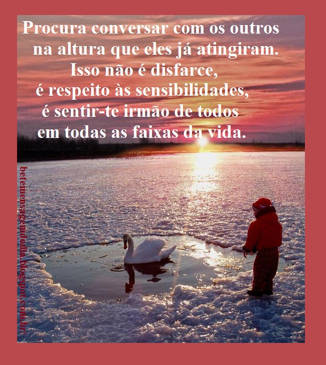 Procura conversar com os outros na altura que eles já atingiram. Isso não é disfarce, é respeito às sensibilidades, é sentir-te irmão de todos em todas as faixas da vida.