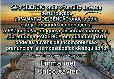 Sê o silêncio onde o tumulto ameace perturbação, a palavra de bênção onde o ódio esteja lançando condenações, a paz no lugar em que a discórdia apareça e, sobretudo, a paciência em qualquer parte onde as nuvens da incompreensão prenunciem a tempestade do desequilíbrio.